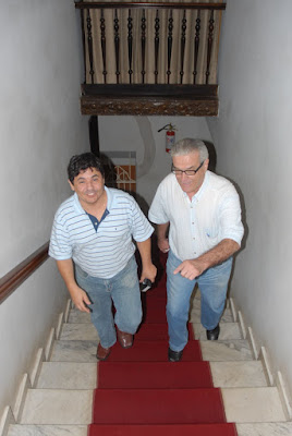 Helinho Pelissari e Sidnei Quartier (200 anos de jornalismo) sobem as escadas da prefeitura onde trabalharam há alguns anos. O cabelo do Helinho continua o mesmo. Mas os cabelos do Quartier... Foto: Weber Sian